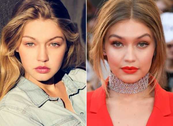 Фото с последней ковровой дорожки Джиджи. Если сравнить его с фото от 2012 года будет видно, что хирургических вмешательств не было. Ее брови стали толще, а верхняя губа увеличена за счет контура.