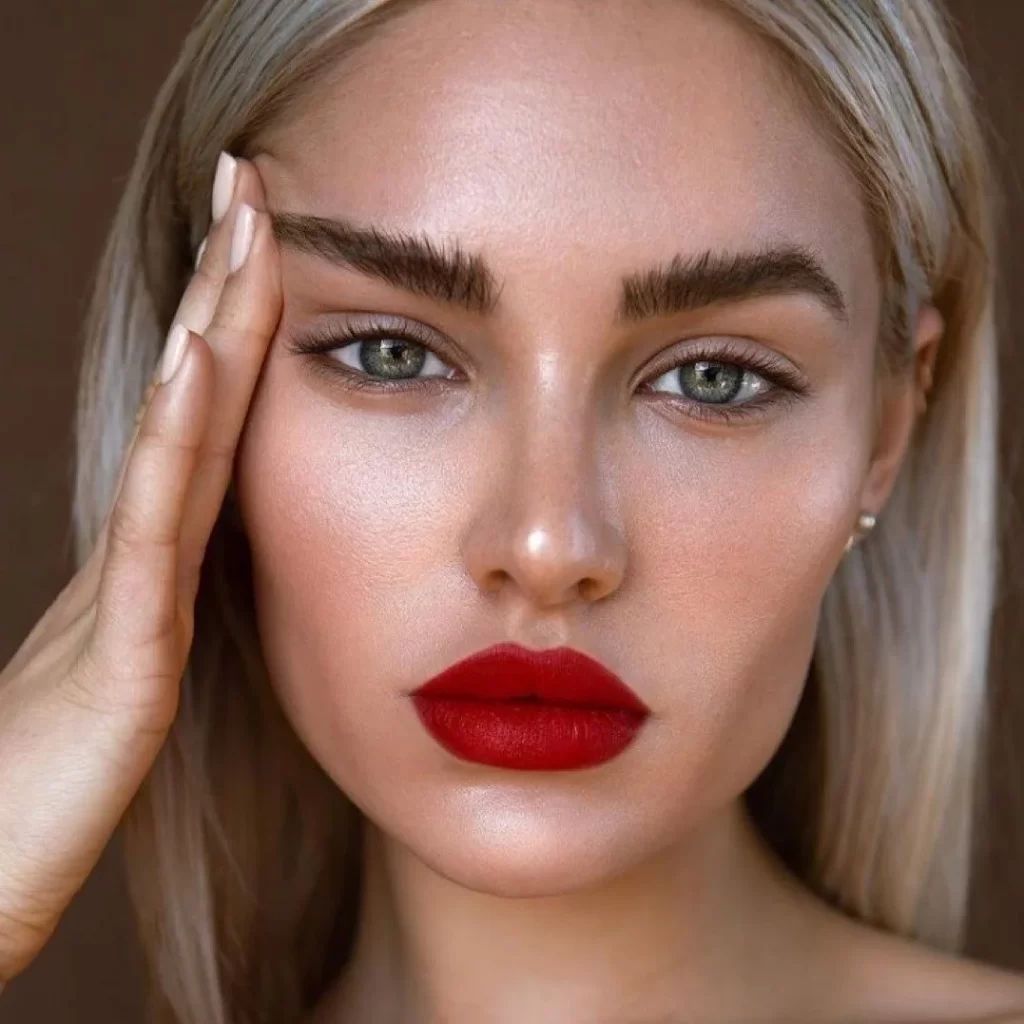 Матовые губы. Такой макияж смотрится эстетично, привлекательно, но матовая помада отличается сухостью и стойкостью по сравнению с глянцевой. Поэтому макияж губ у девушек получается стойким, насыщенного цвета. Однако по этой причине он выделяет неровную поверхность губ. Чтобы избежать такого эффекта, губы нужно хорошо подготовить к макияжу. Если используют матовую помаду, то макияж глаз делают не слишком ярким. Нужно только подчеркнуть брови, нанести тональные средства и подкрасить ресницы. Выбирать окраску помады нужно по цвету кожи. При смуглой коже помаду применяют теплых тонов, если светлая — холодных тонов. Красная помада подходит всем.