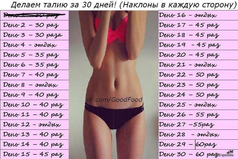 И последнее, но очень важное условие эффективного похудения за месяц — занятия спортом для похудения живота и боков должны носить регулярный характер. Есть специальные программы, рассчитанные на 30 дней по три периода занятий сроком на 10 дней