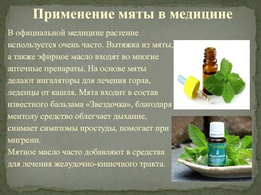 Рекомендуется стоматологами в качестве освежителя полости рта, эффективно избавляющего от неприятных запахов. Уменьшает воспалительные процессы в деснах при кариесе, пародонтозе и стоматите, а также боль – как зубную, так и в деснах. Масло мяты эффективно при болях в мышцах вследствие тяжелого физического труда. Влияя на обмен жиров в организме, нормализует показатели холестерина, способствует выведению его излишков. Благоприятно влияет на женский организм, регулируя менструальный цикл, менструации становятся менее болезненными. Устраняет аллергию на укусы насекомых (красноту, жжение, отечность, зуд на месте укуса).