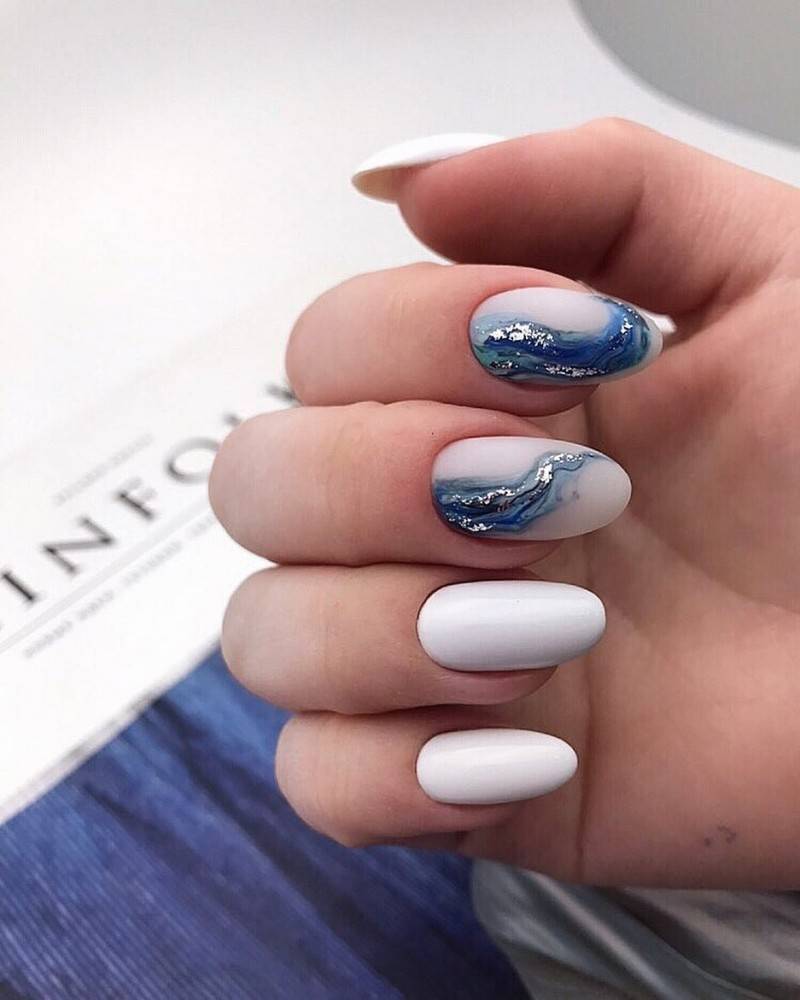 Мраморный маникюр представляет собой иммитацию природного камня на ногтевой пластине. Среди классического исполнения можно отметить серые, белые и черный оттенки – они превосходно сочетаются между собой и подойдут для ежедневного ношения. Оригинальным решением станет выбор зеленого или синего цветов для того, чтобы «нарисовать» малахит и любой другой драгоценный камень на ногтях.