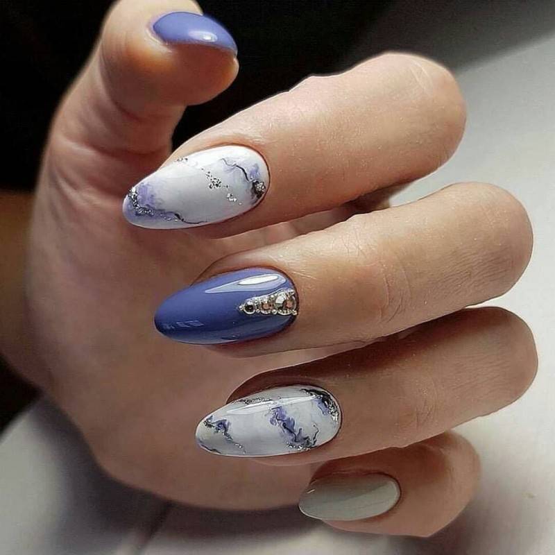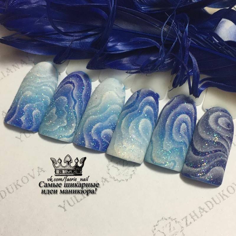 Еще один вариант дизайна с разводами – это стразы. Они никогда не будут лишними, особенно в сочетании с нежными витиеватыми узорами. Располагайте стразы в прикорневой зоне, выделяйте ими границы узора, выполняйте инкрустацию на безымянном пальце или мизинце.