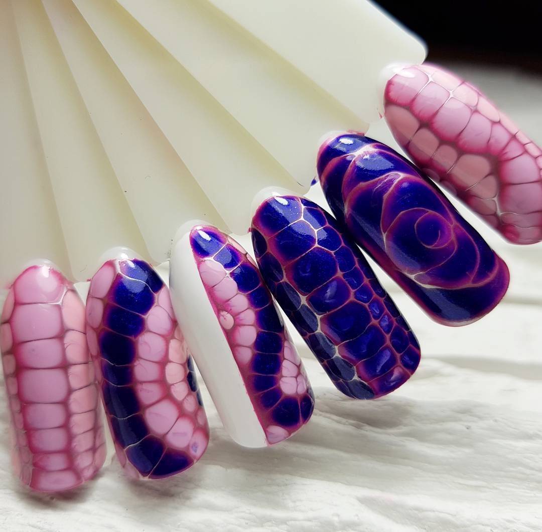 Разводы отлично смотрятся в дизайне с геометрией. Для этого выполняйте окантовку узора с разводами прямыми тонкими линиями, треугольниками. Выполняйте узор с разводами внутри ромбов и треугольников. В качестве цвета для окантовки можно использовать черный или белый гель-лак.