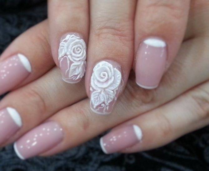 Френч является прекрасным украшением ваших ноготков. Белый френч с белыми розами, узорами отлично подойдет для лета, весны. Этот маникюр делается несложно.