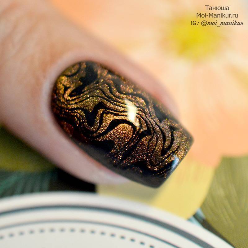 Важно! Для стемпинга на гель-лаке кошачий глаз, чтобы сделать такие красивые переходы из черного в рассеянный блик, нужно использовать именно черный цвет краски