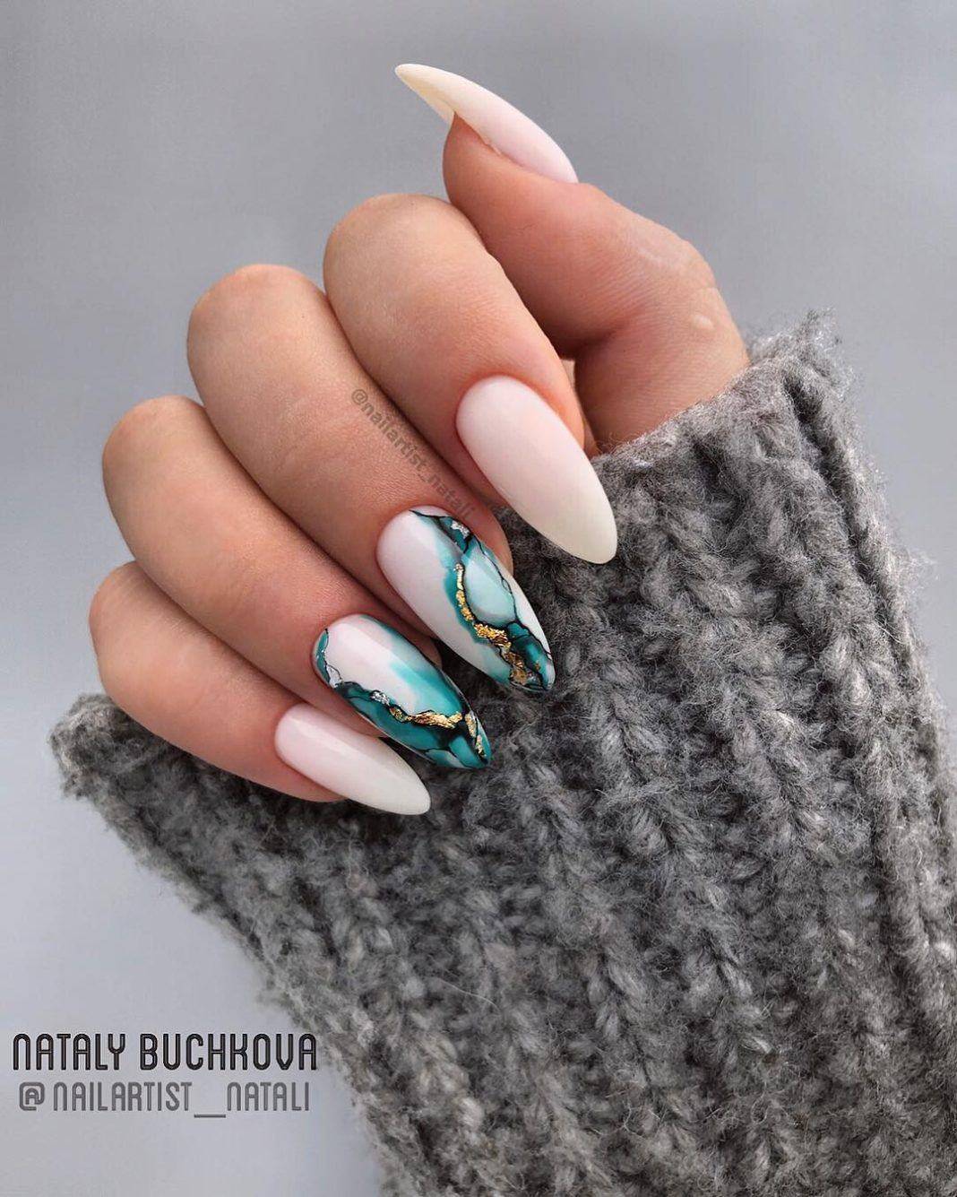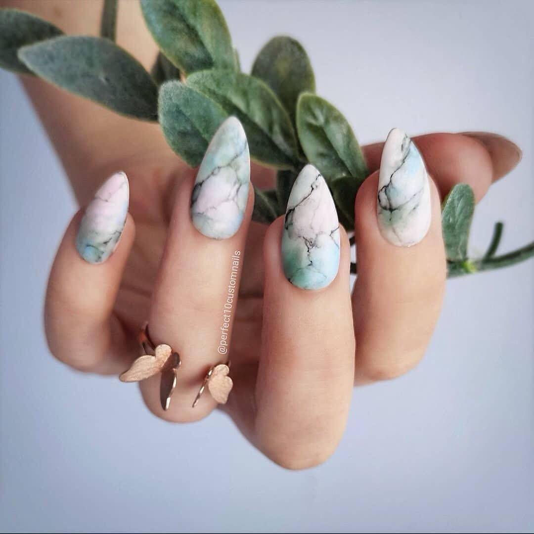 Мраморный маникюр представляет собой иммитацию природного камня на ногтевой пластине. Среди классического исполнения можно отметить серые, белые и черный оттенки – они превосходно сочетаются между собой и подойдут для ежедневного ношения. Оригинальным решением станет выбор зеленого или синего цветов для того, чтобы «нарисовать» малахит и любой другой драгоценный камень на ногтях.