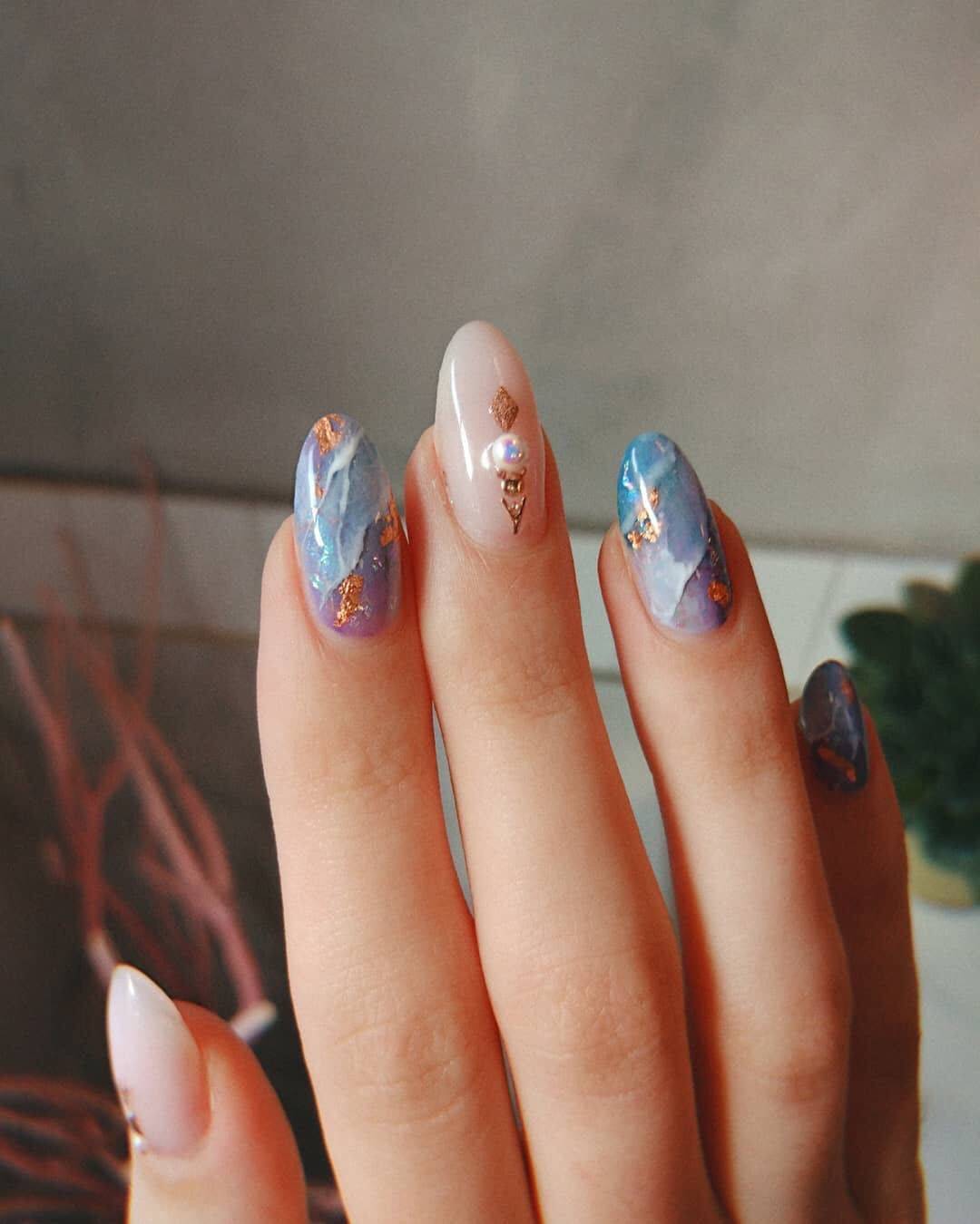 Воссоздать природный рисунок камня на ногте не сложно: существует несколько техник выполнения рисунка с использованием воды или обычной зубочистки. Сделать подобный рисунок на ногтях дома тоже можно, главное – вооружиться знаниями, терпением и несколькими баночками с гель-лаком.