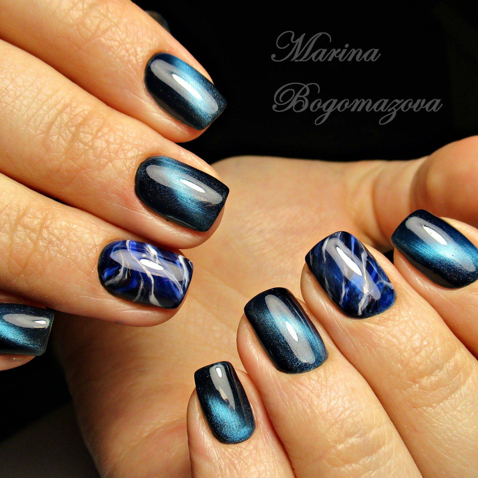 - После этого я нанесла гель-лак кошачий глаз с двойным бликом, промагнитила его со всех сторон для получения рассеянного блика под разным углом и высушила.