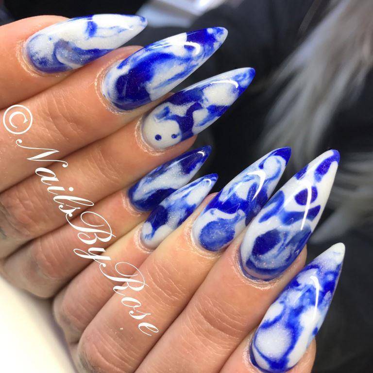 – указательный и средний или средний и безымянный. Для ярких женщин подойдут темные основные оттенки и светлые контрастные разводы. Необычно смотрится синий и белый с вкраплениями золота, ровно как и насыщенный зеленый, фиолетовый, желтый, черный, голубой.