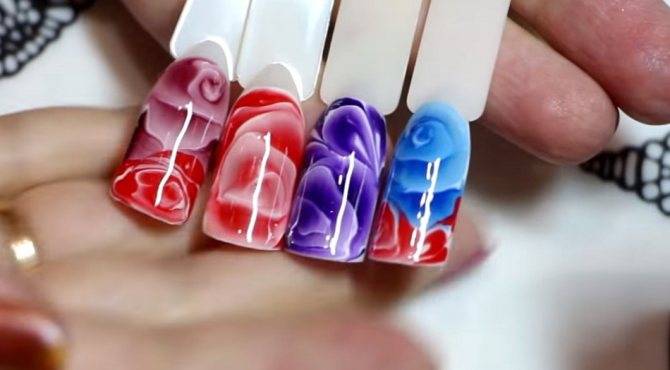 Такие основы могут быть достаточно плотными и густыми, но при этом лаки на них будут растекаться очень хорошо, создавая причудливые узоры. Если все это соединить небольшими мазками кистью, или работать дотсом, получаются просто шикарные шедевры. Дополнить их можно прорисовкой, а также бульонками и стразами. Так удается добиться уникальных рисунков. В основном такие приемы используются в флористике. Всего существует несколько направлений и групп дизайнов, которые можно создать при помощи растекающихся лаков.