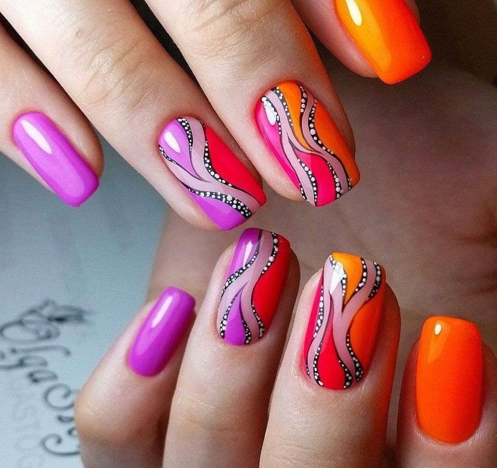 Абстрактный дизайн в маникюре тоже создается мастерами из сочетания цветов и различных геометрических элементов: пятен, точек, мазков, линий, завитков, абстрактных лиц и фигур. Такой дизайн подойдет под любой образ. Его можно делать ярким или нежным, на длинные или на короткие ногти, подобрать под наряд или сделать в трендовых цветах сезона.
