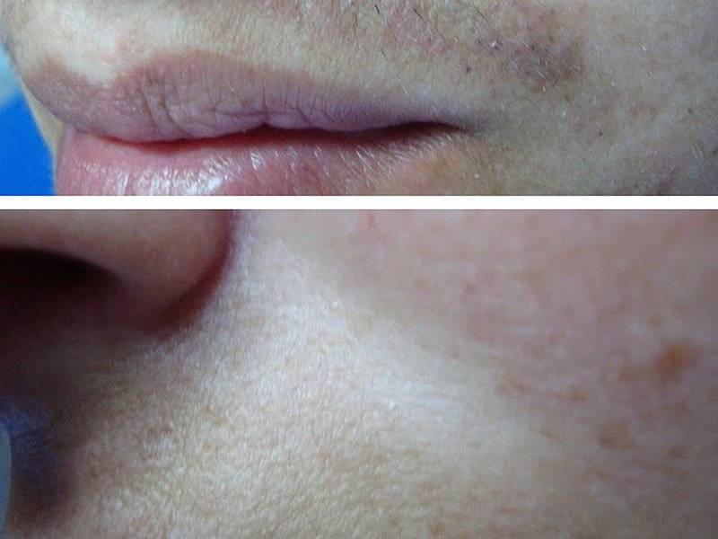 Небольшие пигментные пятна в продепеллированной области возникают в случае нарушения рекомендованных правил после процедурного ухода или длительного пребывания под УФ-лучами.