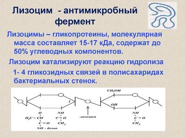 - Лизоцим. Стимулирует местный иммунитет. Угнетает рост патогенных бактерий. Снижает интенсивность воспалительных процессов.