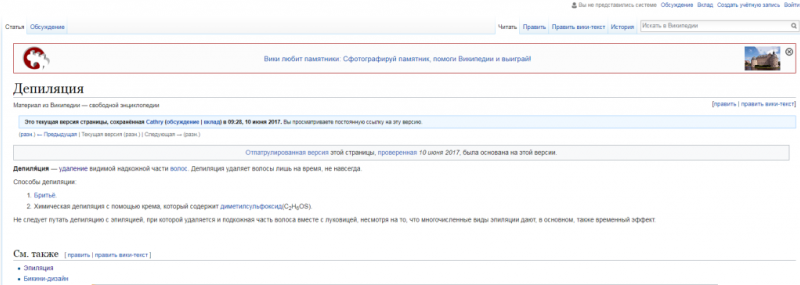 ВАЖНО: Хоть на момент публикации данной статьи страница в Википедии про депиляцию осталась неизменной мы всё же укажем адрес статьи на основе которого мы проводили анализ. С последней версией статьи вы всегда можете найти через поиск Гугла по запросу “Депиляция” или по прямой ссылке