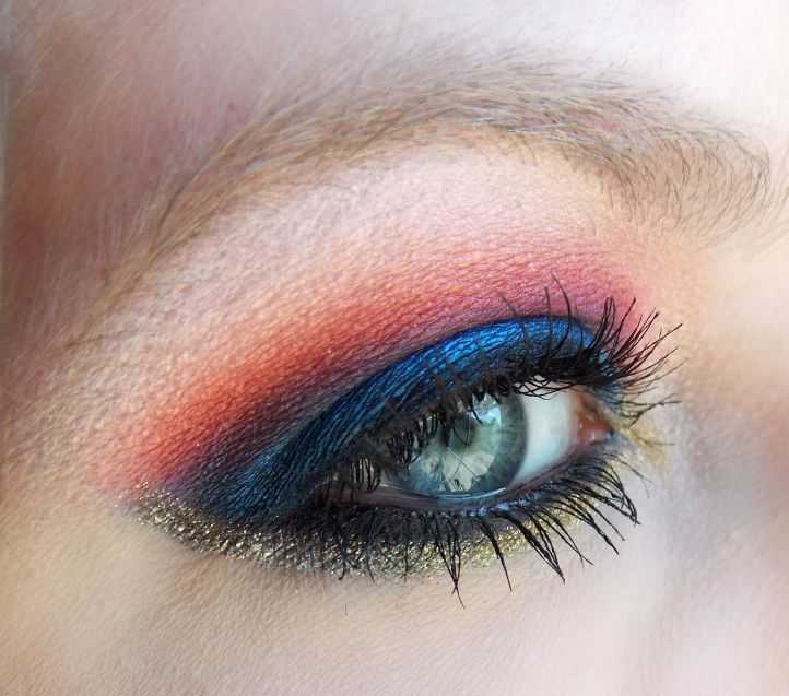 Летняя вечеринка или сумасшедшее настроение – сочный мейк-ап способен выразить царящее настроение. Основную поверхность прокрашиваем синими аккордами, добавляем фиолетовых и огненных оттенков на область над верхним веком. Аккуратно подчеркиваем контуры глаз, добавляем золотые акценты во внутренний уголок и по нижней границе. Придаем ресничкам очаровательные изгибы и длину. Неповторимый макияж для девушек с русыми волосами способен свести сума своим красочным наполнением, покорить живостью и неординарностью.