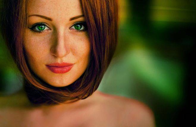 Рыжие локоны и глаза зеленого цвета – магическое сочетание, привлекающее своей яркостью и контрастностью. Часто зеленый оттенок у рыжеволосых бестий присутствует в макияже, аксессуарах и нарядах. Вечерний выход в свет дополняет мейк-ап в тон глазам, с добавлением коричневых, сливовых, медных или бронзовых акцентов.