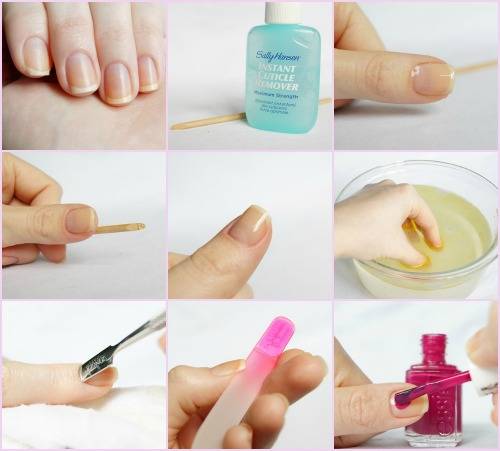Сама процедура должна происходить по той же схеме, что и в салоне красоты, так что все описанные выше шаги остаются актуальными и для самостоятельной реализации мероприятия. Все стоится по простой схеме: подготовка ногтей, корректировка формы, обработка кутикулы, удаление кутикулы, завершающий этап (нанесение кремов и покраска ногтей).