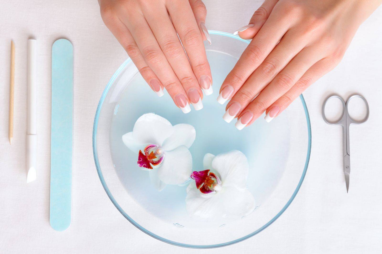 Затем при мокрой разновидности европейского маникюра делают теплую ванночку для ногтей. Для этого в воду добавляют специальные лосьоны, которые помогают быстрее распарить руки, или несколько капель любого эфирного масла, лимонного сока или долек лимона.