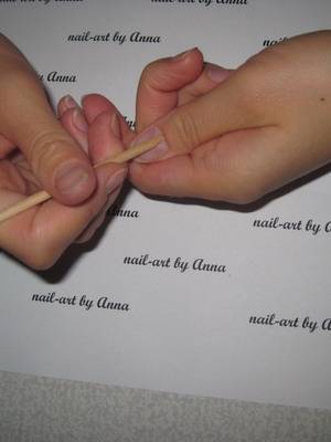 Апельсиновой палочкой удалите излишки кутикулы и отодвиньте кожу, открывая лунку, придавая ей форму.