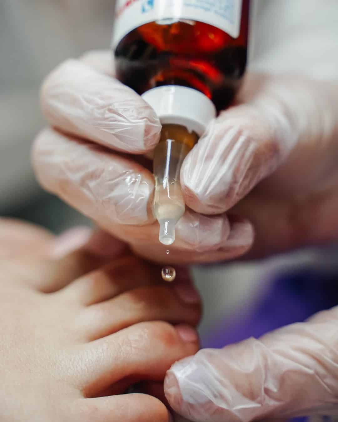 На последнем этапе на стопы наносят регенерирующие и противогрибковые препараты, а на ногти, если они не были повреждены или удалены, — противогрибковый лак.