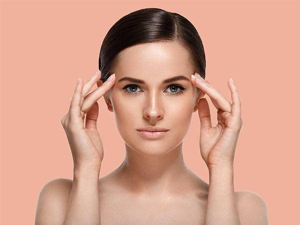 Положите ладонь на цент лба пальцами вниз. Сделайте вдох, посмотрите на нос. Выдохните, поднимая глаза, аккуратно потяните кожу вверх. Повторите 3 – 5 раз.