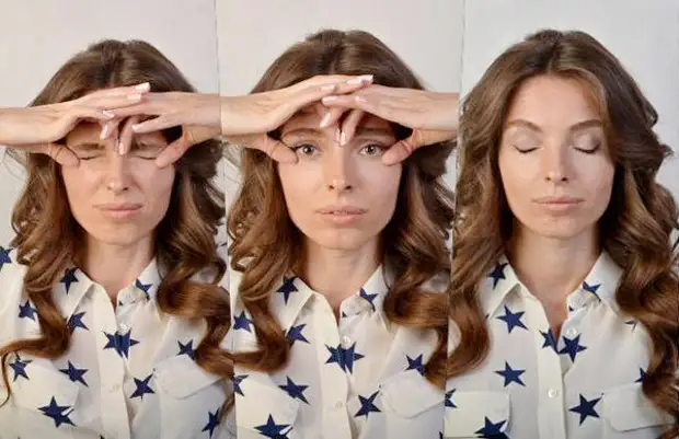 Положите четыре пальца обеих рук на лоб. Медленным движением проведите пальцами наружу, слегка надавливая. Таким образом, напрягаете мышцы лба и одновременно расслабляете лицо.