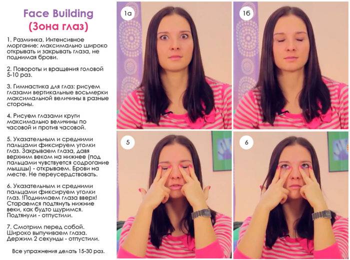 Фейсбилдинг поможет уменьшить нависание верхнего века, а также подтянуть нижнее. Эффект наступает медленно, поэтому необходимо набраться терпения и регулярно заниматься. Между упражнениями нужно быстро поморгать глазами 20-30 раз.