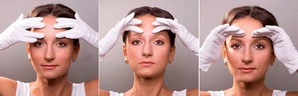 - Упражнение 1. Положить ладони на лоб и виски, пальцы разместить в центре лба. Брови поднимать вверх, пальцами оказывать сопротивление. При этом на лбу не должны образоваться морщины.