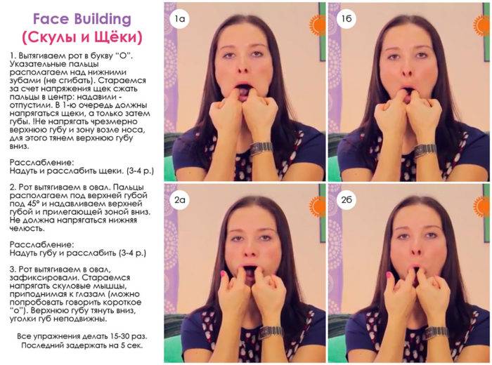 Упражнение для тренировки боковых сторон щек заключается в том, что нужно изобразить ртом овал, мышцы щек плотнее прижимают к скулам. Щеки прижать ладонями и поднимать ладони к вискам, представляя, что ваши щеки движутся в том же направлении
