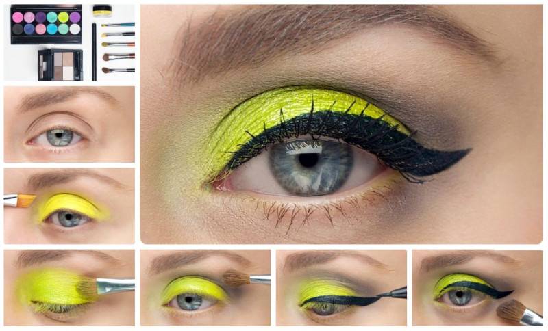 Для воспроизведения этого образа достаточно иметь базовую основу, тени салатового, бежевого цвета, черная и подводка ярко-лимонного тона. Кисточки для растушевки и черная тушь.