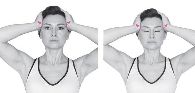 Положите две руки ладонями вниз на лоб над бровями, пальцами навстречу друг другу. Мизинцы расслабьте. Ладонями слегка сдвиньте кожу вниз и в стороны, чтобы почувствовать небольшое натяжение. Поднимайте брови вверх, а руками надавливайте вниз. Повторите 10 раз. Затем задержите поднятые брови со встречным сопротивлением ладоней в статике, сосчитайте до 10.