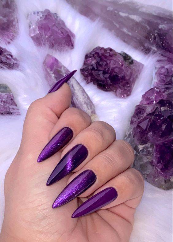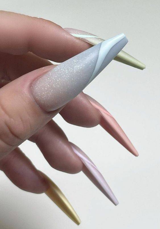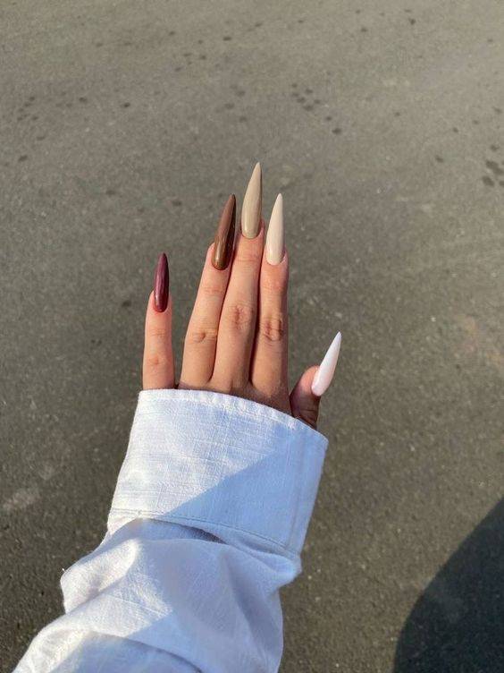 Относительно цветовой гаммы стилеты универсальны – любые сезонные тона, будь то винные и тыквенно-жёлтые осенние или неоново-розовые и васильковые летние будут смотреться на них хорошо. Также не имеет значения насыщенность тона – бледно-голубой или мятный не менее эффектен на «пиках» нежели марсала или шоколад.