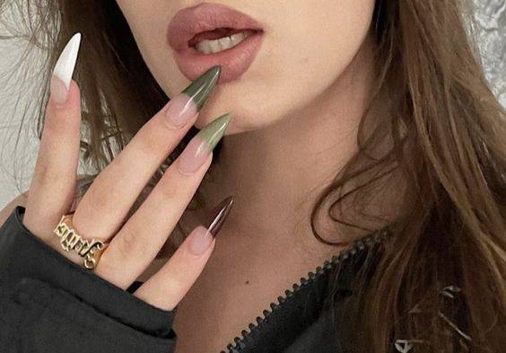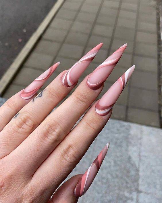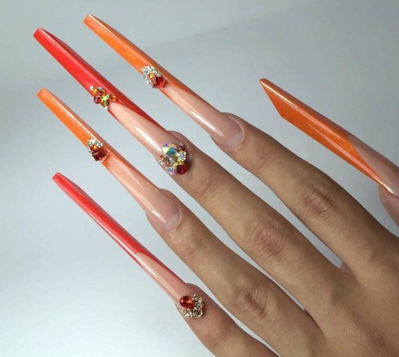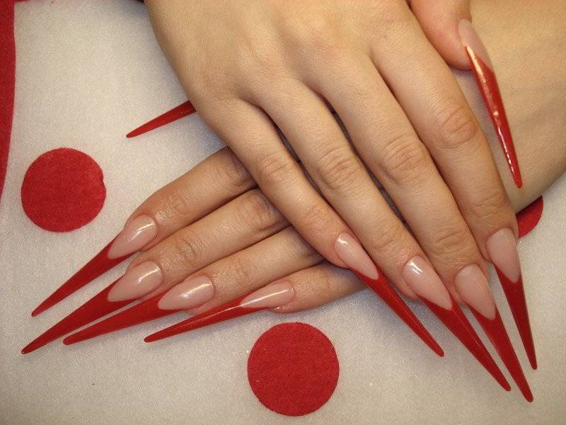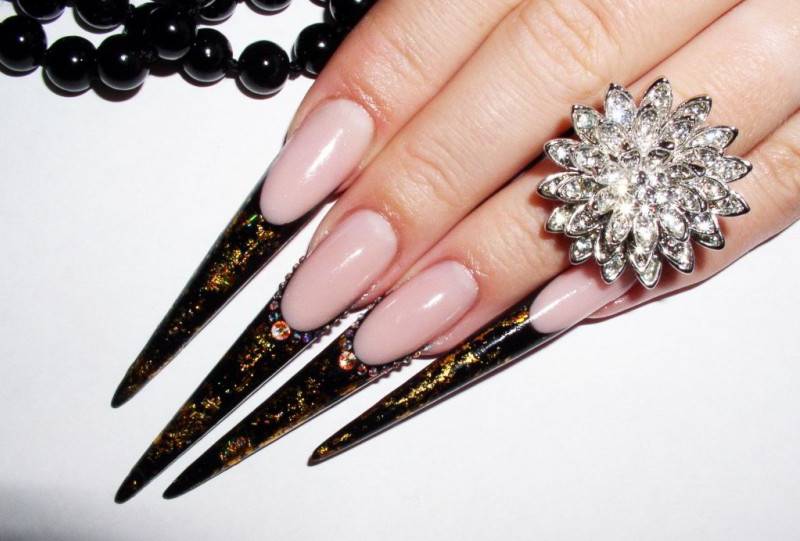 Это самые длинные ногти, носящие название стилеты. Иногда они просто поражают своей экстремальной длиной и остротой. Это сильно зауженная к концу ногтевой пластины форма, которая не подойдет для ношения в повседневной жизни, так как постоянно будет цепляться за одежду. Но самый благодатный вариант для воплощения в жизнь разнообразных экзотических дизайнов. На ногтях такой длины любой дизайн будет смотреться как произведение искусства. Схема создания заключается в том, что мастер удлиняет их как можно сильнее, постепенно заостряя при помощи опиливания. Визуально их можно удлинить еще больше, сделав френч в стиле «ласточкин хвост», как на фото. Очень оригинально на стилетах-пиках смотрятся мелкие стразы, делая дизайн еще более изящным.