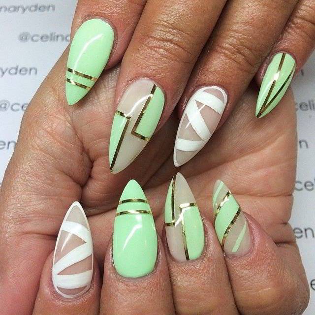 Для ногтей формы стилет подойдет практически любой дизайн. Однотонное покрытие, френч, втирка, кмбинация цветов, сложные дизайны-лепка, литье. Не стоит перегружать все ногти большим количеством декора.