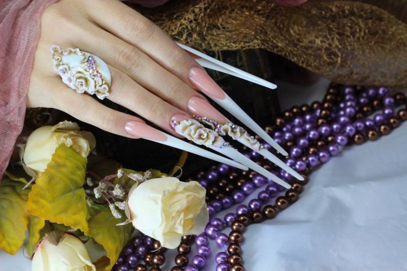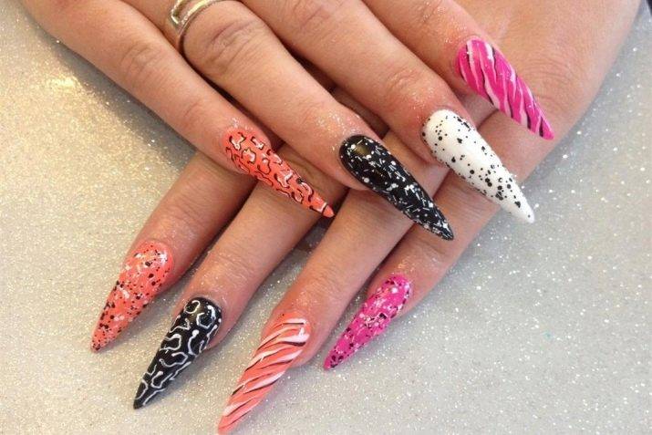 Наращивание ногтей острой формы и чрезмерной длины выполняют чаще для торжественных случаев и для конкурсов. Проводить какие-либо работы по дому с такими ногтевыми пластинами довольно неудобно. При огромном желании иметь длинные формы ногтей рекомендуется создавать короткий стилет.