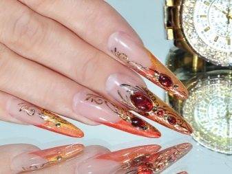 Сложные дизайны – с элементами лепки, литьём, «жидкими камнями» – также могут быть выполнены на этой форме, однако, не следует злоупотреблять количеством элементов. Лучше выделить таким образом один или два ногтя, оставив остальные однотонными. Обилие деталей может «убить» форму стилетов, сделав её вульгарной и аляпистой.
