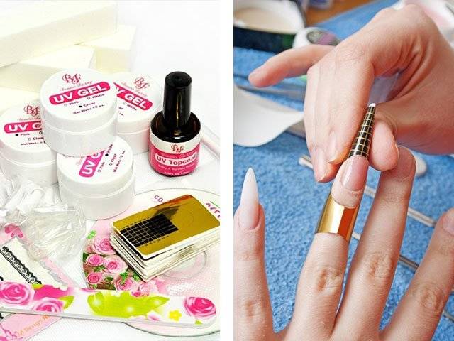 - Накладывают гель или акрил, придавая нужную форму по шаблону.