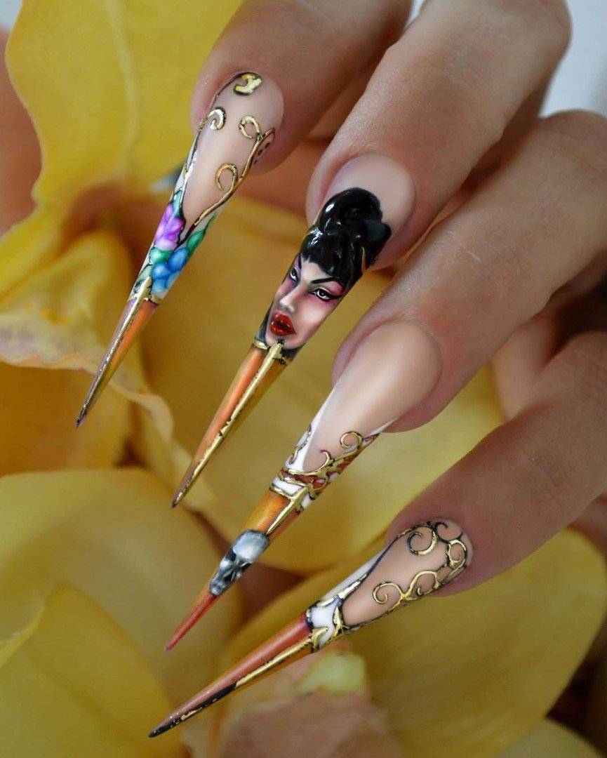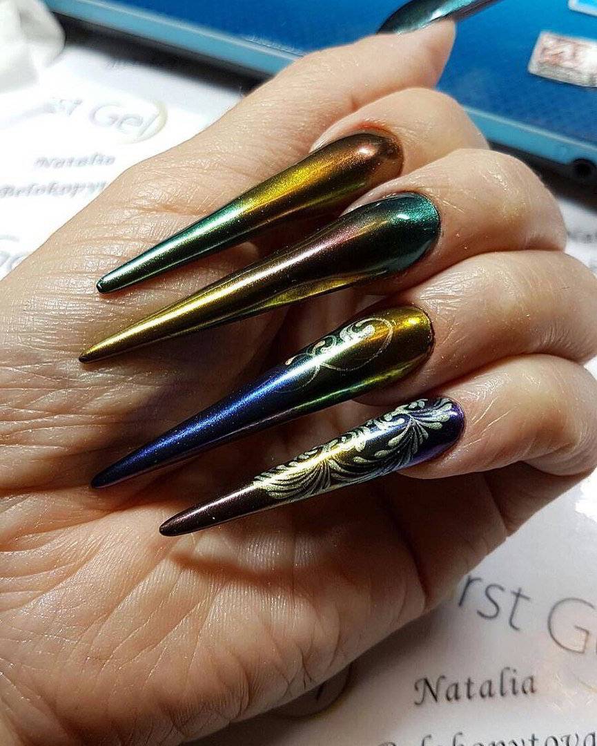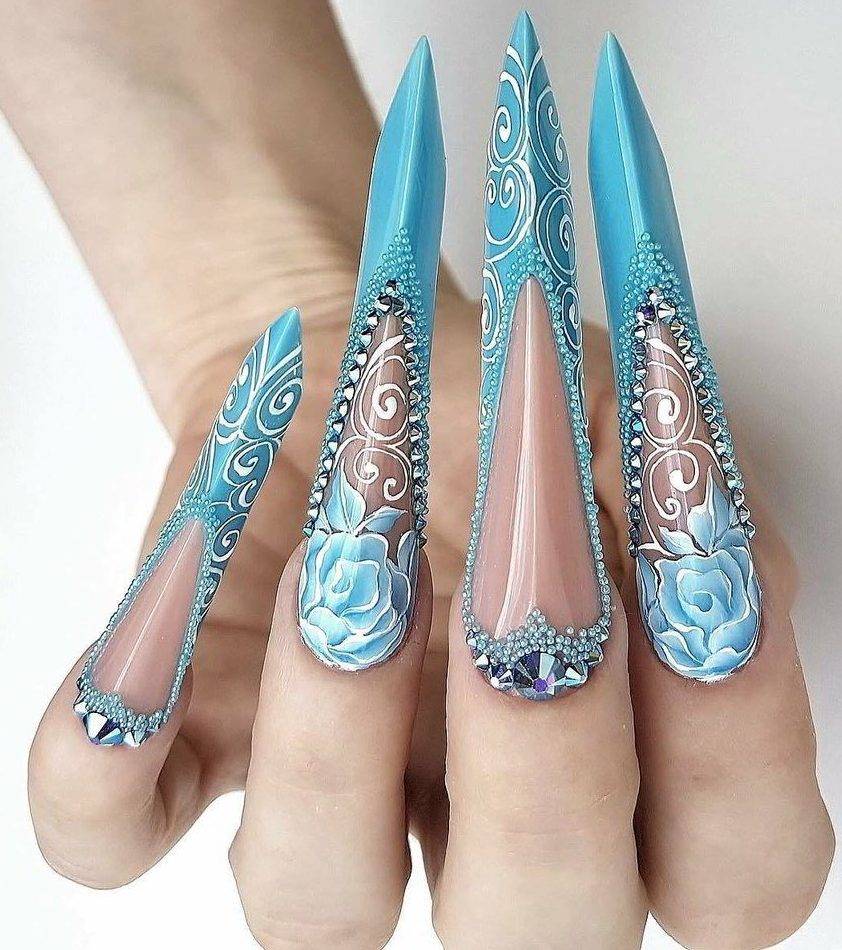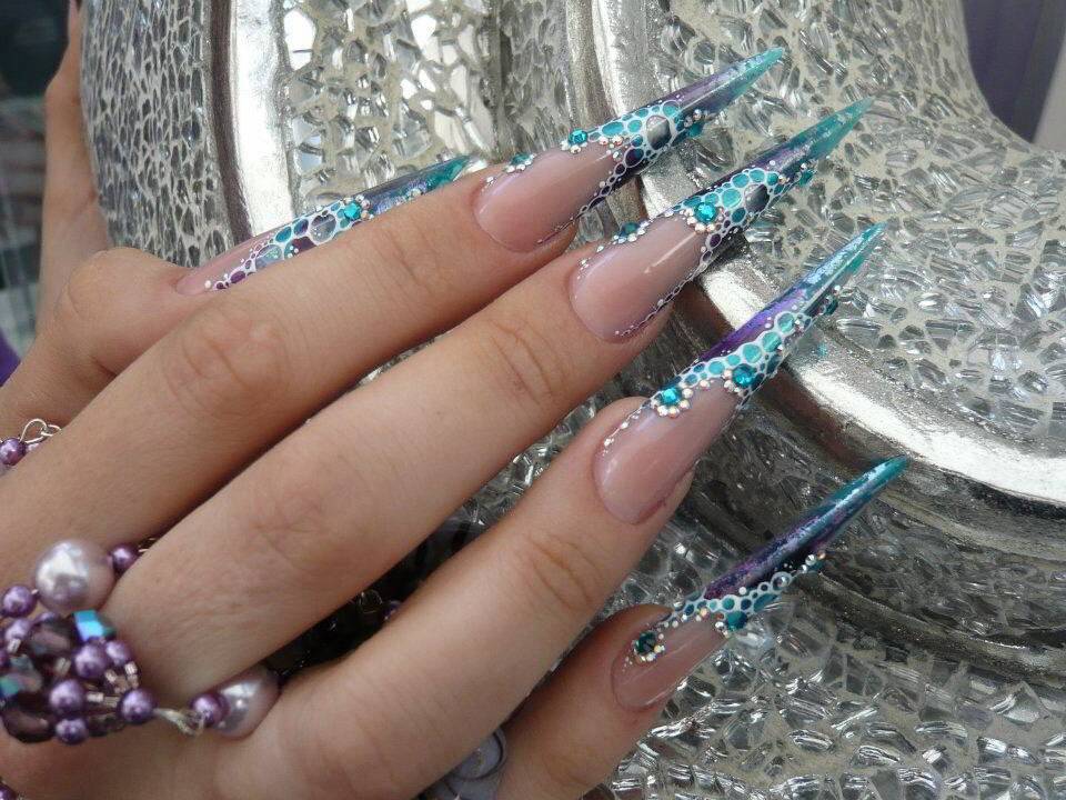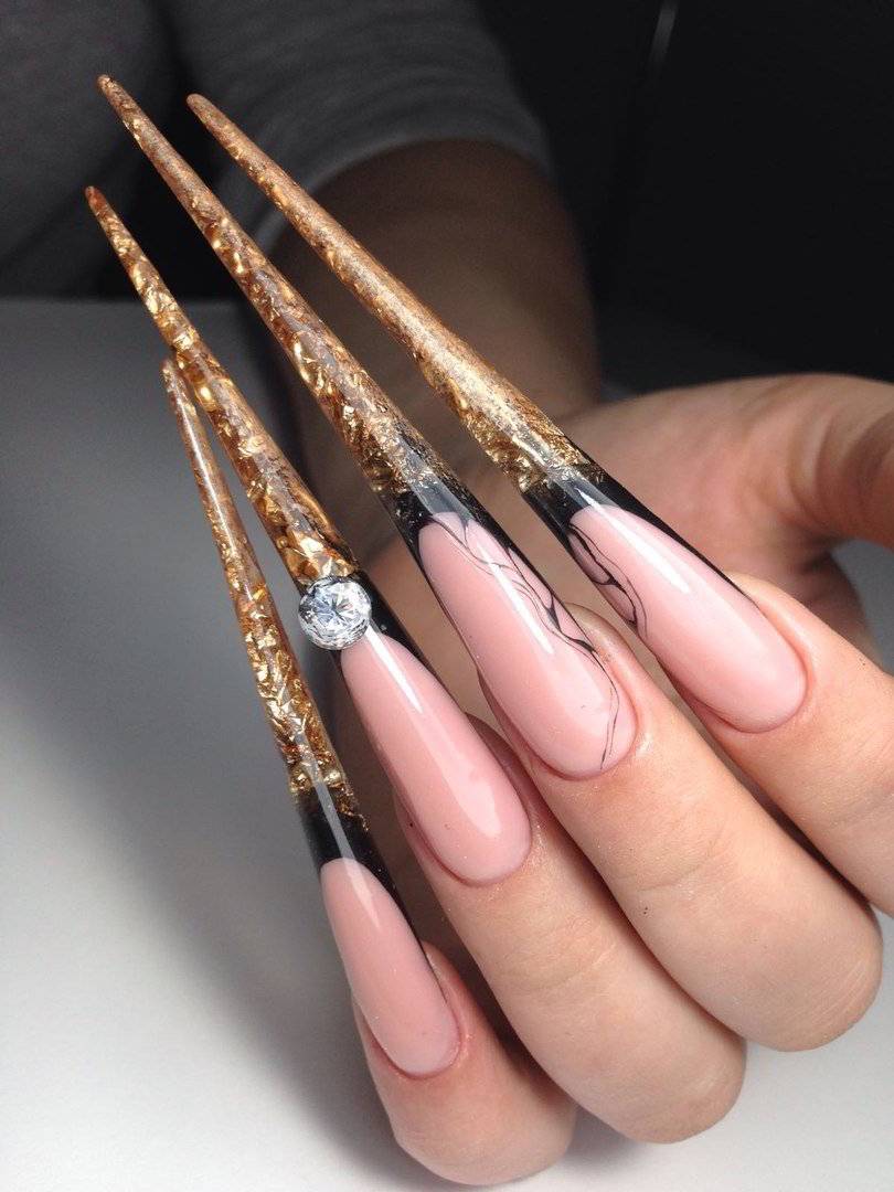 Это самые длинные ногти, носящие название стилеты. Иногда они просто поражают своей экстремальной длиной и остротой. Это сильно зауженная к концу ногтевой пластины форма, которая не подойдет для ношения в повседневной жизни, так как постоянно будет цепляться за одежду. Но самый благодатный вариант для воплощения в жизнь разнообразных экзотических дизайнов. На ногтях такой длины любой дизайн будет смотреться как произведение искусства. Схема создания заключается в том, что мастер удлиняет их как можно сильнее, постепенно заостряя при помощи опиливания. Визуально их можно удлинить еще больше, сделав френч в стиле «ласточкин хвост», как на фото. Очень оригинально на стилетах-пиках смотрятся мелкие стразы, делая дизайн еще более изящным.