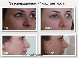 Филлер способен как прибавить ткань, так и поспособствовать ее рассасыванию. Так, это актуально в том случае, если удаляется горбинка. Есть также специальные гормональные препараты, которые вызывают процесс рассасывания. Такая методика получила широкое распространение при коррекции крыльев носа, кончика носа, а также надкончиковой зоны. Результаты процедуры можно увидеть уже через 2-3 недели. Иногда такая коррекция проводится в несколько этапов и это неспроста
