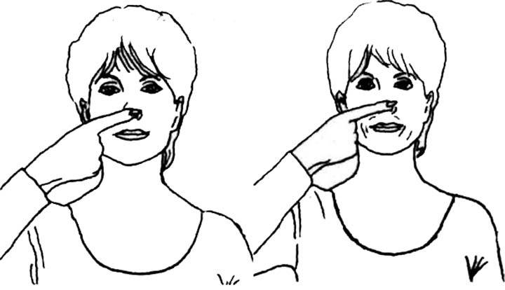 Если вы хотите скорректировать ширину и длину, то нужно тренировать опускающую мышцу. Для этого необходимо напрячь мышцы живота, переднюю часть бедра и область ягодиц двумя пальцами, указательным и большим, взять нос и сжать его и легко надавить. При этом другим указательным пальцем нажать на кончик носа, далее нижнюю губу нужно тянуть вниз вместе с нижней частью носа. На какое-то время фиксируем такое положение, затем расслабляемся, руки убираем. Для того, чтобы был эффект повторять упражнение нужно порядка 35 раз. Благодаря этому упражнению происходит приток кислорода и активизируется кровообращение.
