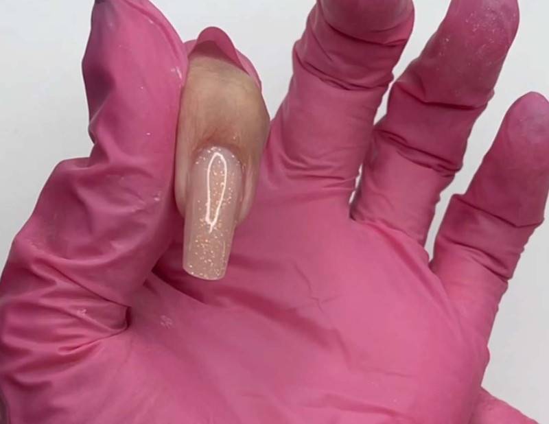 6. Переворачиваем палец и уже изнутри кисточкой выравниваем полигель. Чем лучше в этой зоне разровнять, тем меньше потом нужно будет пилить. Отправляем сушить в лампу.