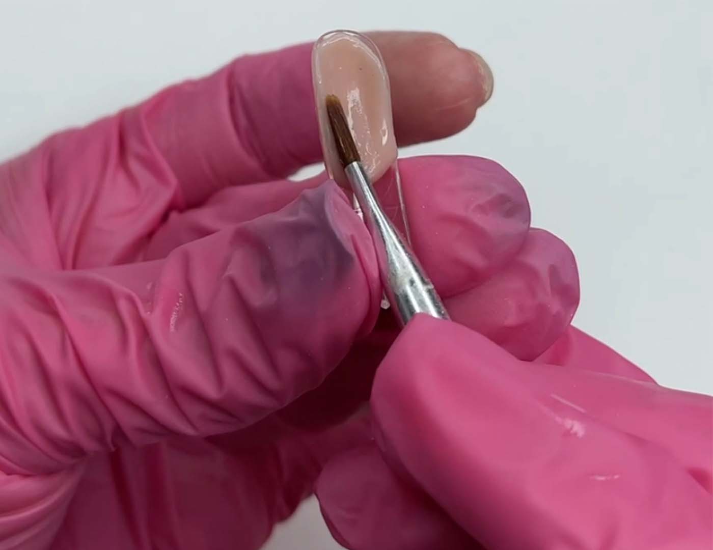 6. Переворачиваем палец и уже изнутри кисточкой выравниваем полигель. Чем лучше в этой зоне разровнять, тем меньше потом нужно будет пилить. Отправляем сушить в лампу.