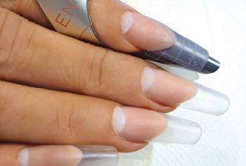 Внутренняя сторона верхних заготовок для наращивания полностью ровная. Именно на внутреннюю сторону и наносится материал для наращивания. Такие шаблоны, как правило, продаются в комплекте. Набор включает в себя типсы разной длины и ширины. Поэтому не составит большого труда подобрать подходящие. По своей структуре, заготовки достаточно эластичны, с ними легко работать. Достаточно одного легкого надавливания, и они полностью совмещаются с натуральным ногтем.