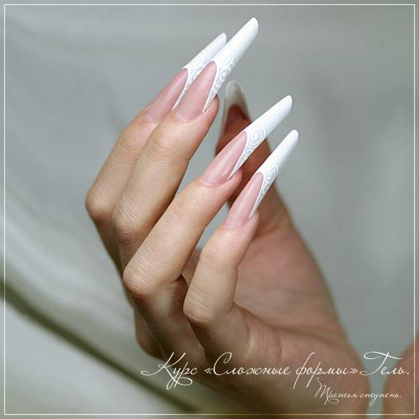 - Стилет. Это безусловно длинные ногти, так как свободная часть ногтя сильно заострена. Дизайн маникюра — яркий и броский.