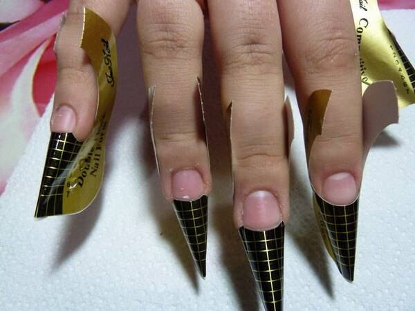 Стоит ознакомиться с технологией нанесения таких внешних форм. Как всегда, все начинается с дезинфицирования рук о ногтей. Только после этого можно провести полноценный маникюр: удалить кутикулы, отшлифовать поверхность пластины, подпилить длину ногтей. Далее подбираются подходящие формы. Внутрь заготовки укладывается материал для наращивания, и равномерно распределяется по ней. Затем наполненная форма крепится к ногтю. Нужно очень аккуратно надавить на нее, и удалить остатки акрила или геля.
