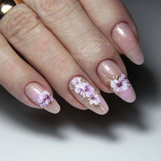 - Круглая. Выполняется преимущественно на короткие ногти. Очень удобна и практична. Цветочные рисунки на нарощенных ногтях круглой формы смотрятся особенно хорошо.