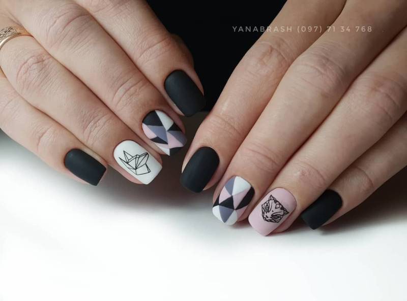 За основу обычно берут статичный цвет — чёрный, нюдовый, серый. Геометрию наносят на один ноготок — кошечку, волка, колибри, сову и т. д. Все они выполняются чёткими линиями. Может потребоваться инструмент: трафарет или слайдер.