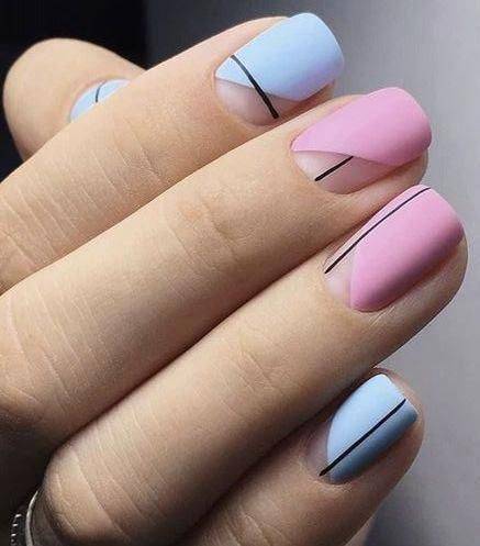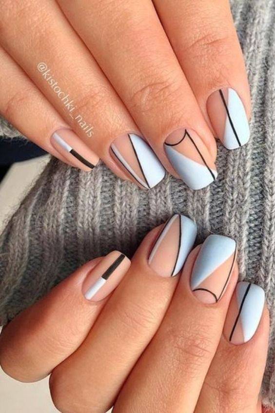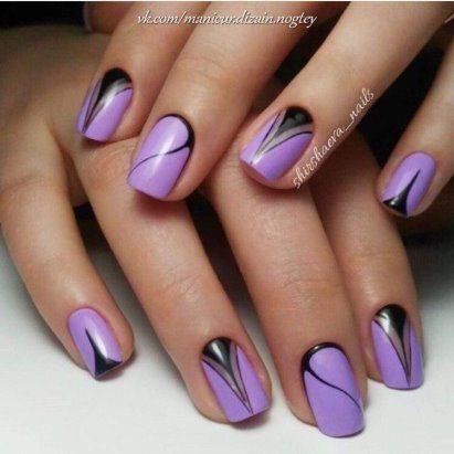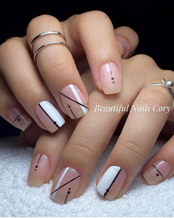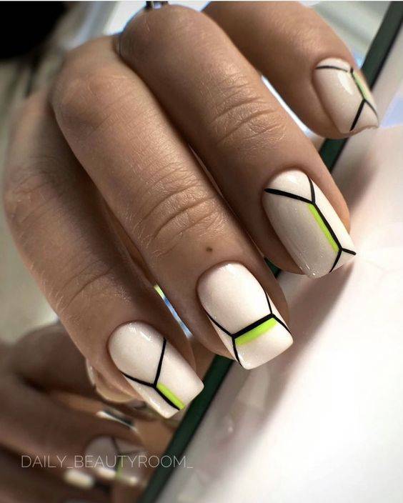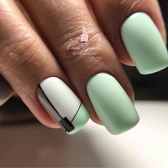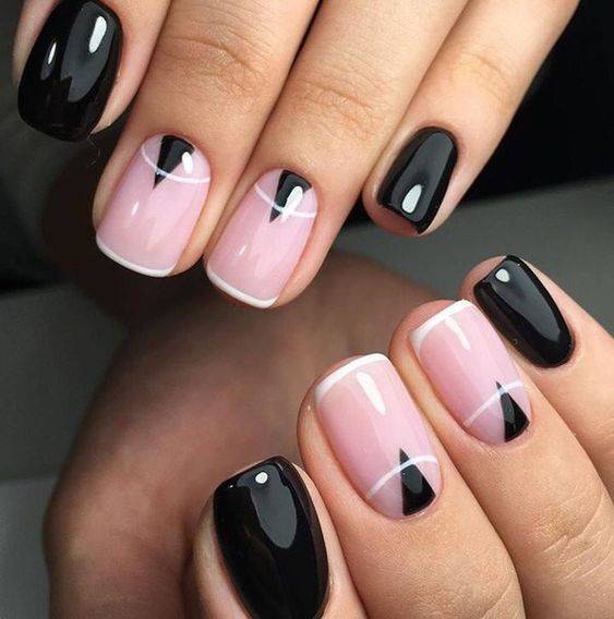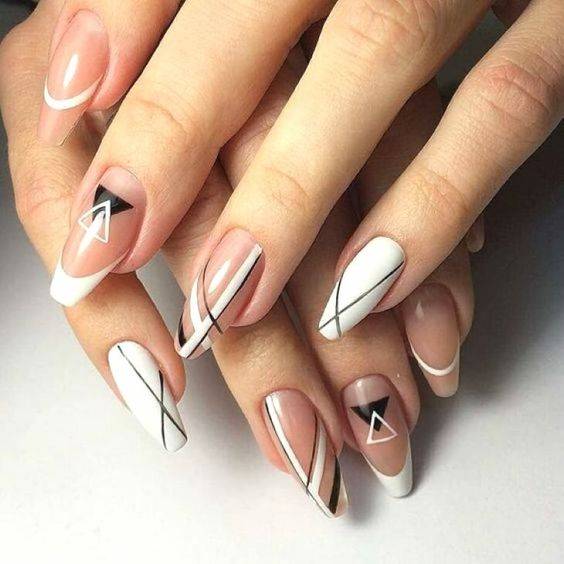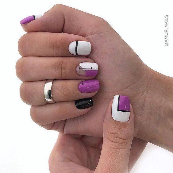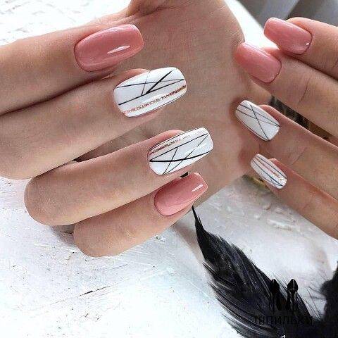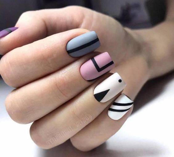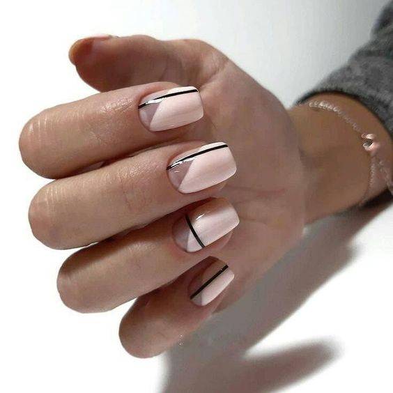 Эффектен для выполнения маникюра в стиле минимализм. За основу чаще берут базу. Геометрию выполняют чёрным или белым лаком, но приемлемы и другие цвета