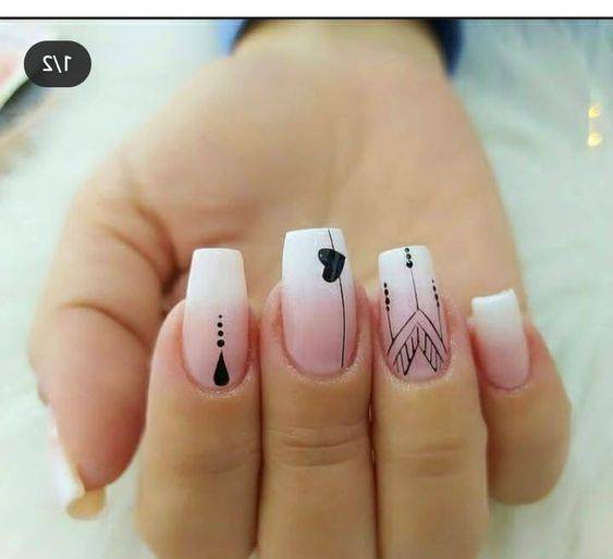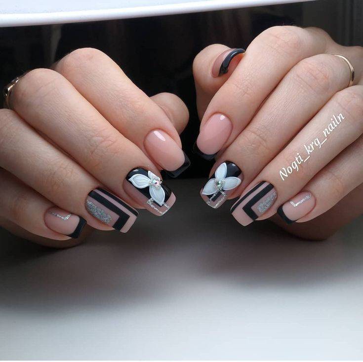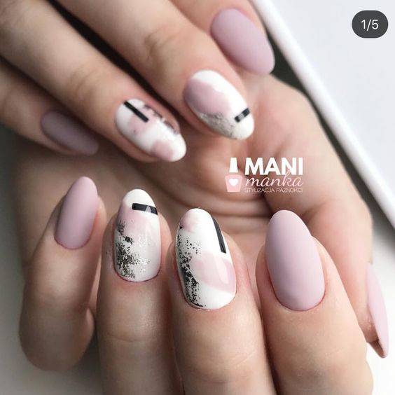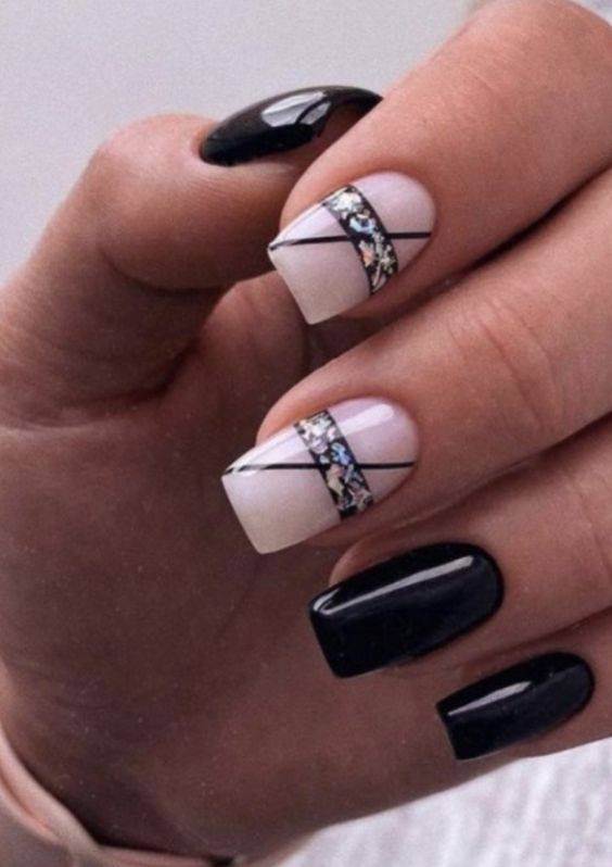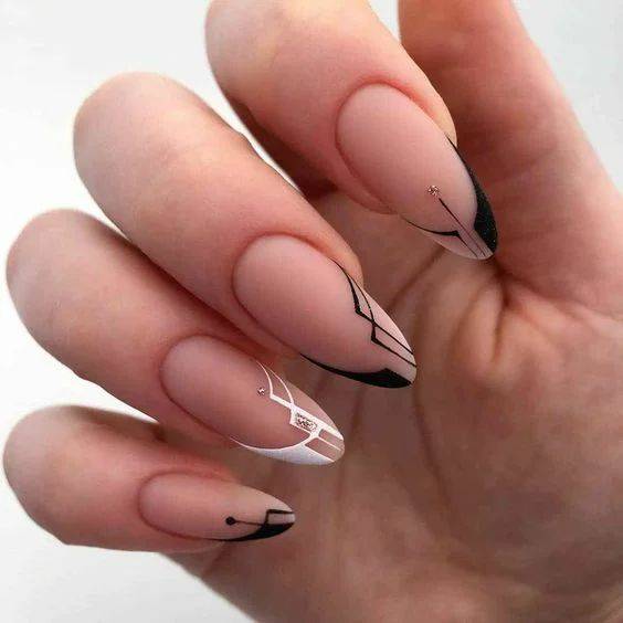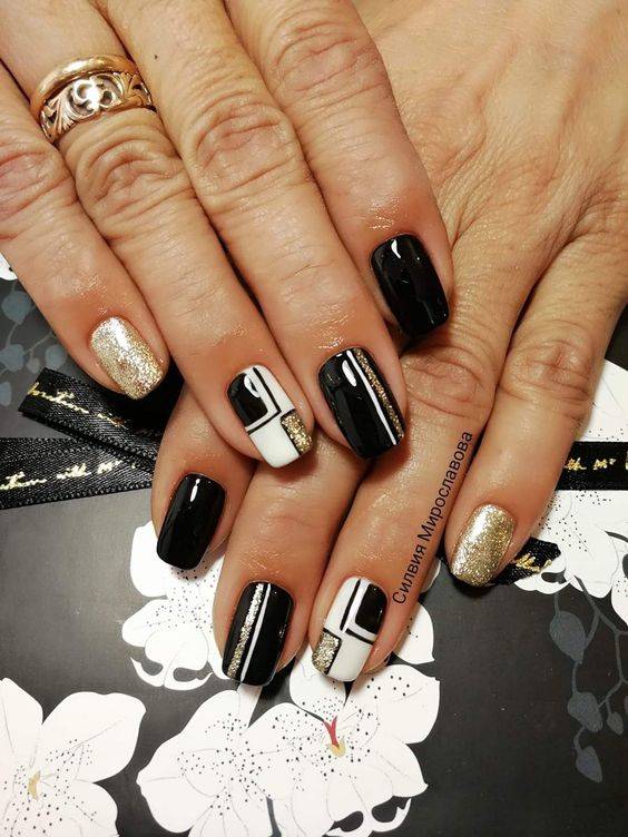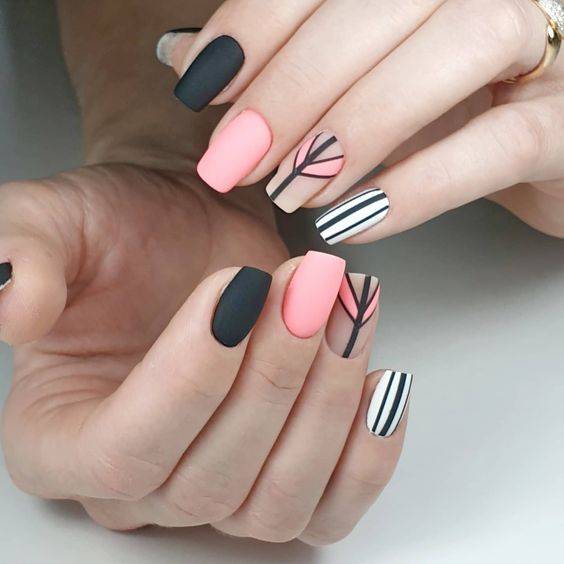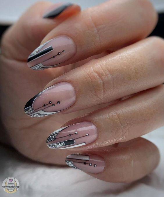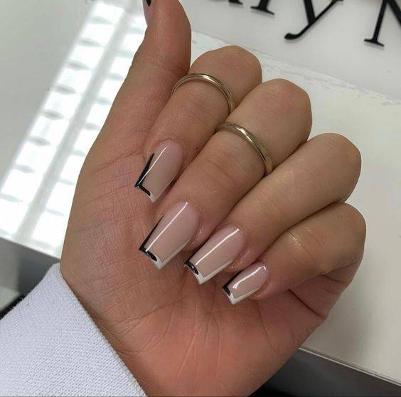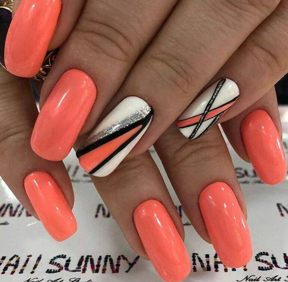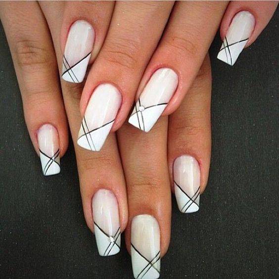Эффектен для выполнения маникюра в стиле минимализм. За основу чаще берут базу. Геометрию выполняют чёрным или белым лаком, но приемлемы и другие цвета