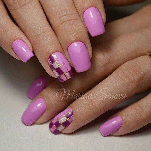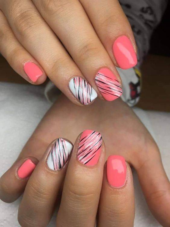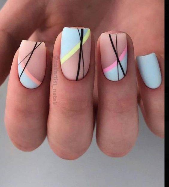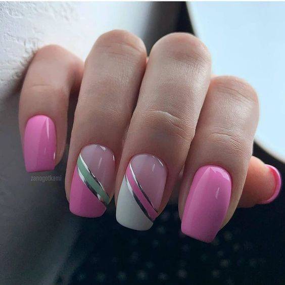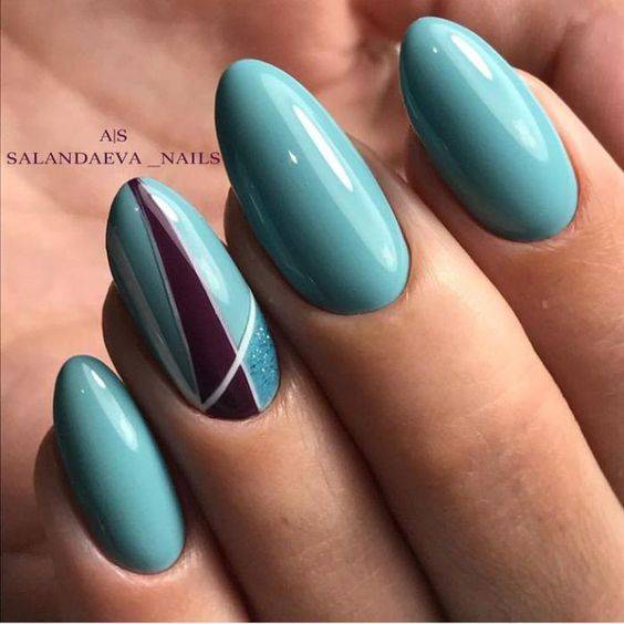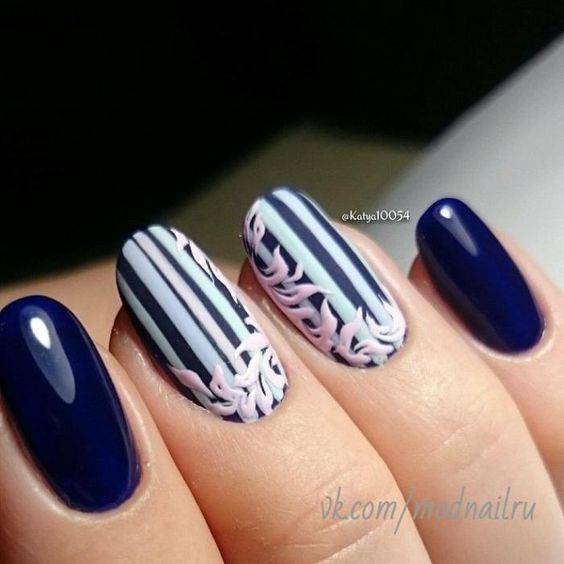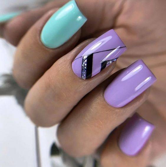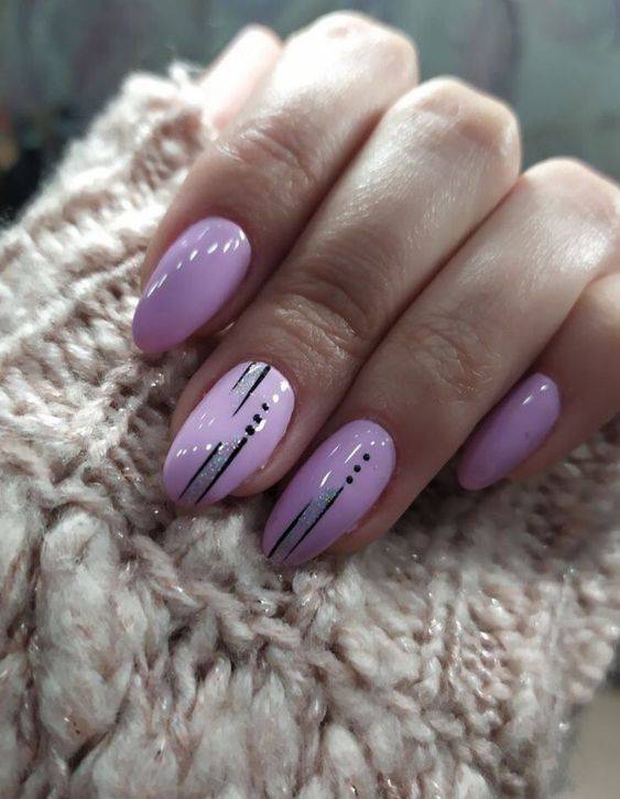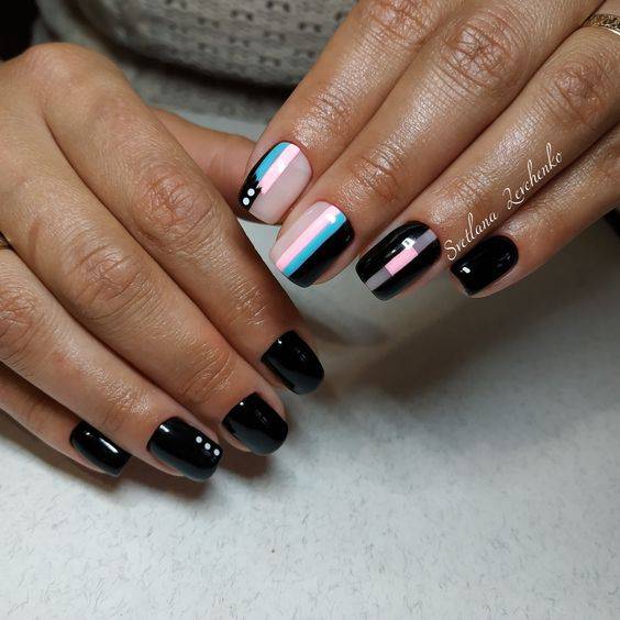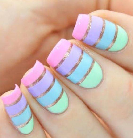 Именно полоски в большей степени нацелены на перспективу. Они способны визуально удлинить поверхность или наоборот. Достаточно взять несколько оттенков, но не более четырёх. Для нанесения полос можно использовать глиттер, фольгу или акриловый песок.